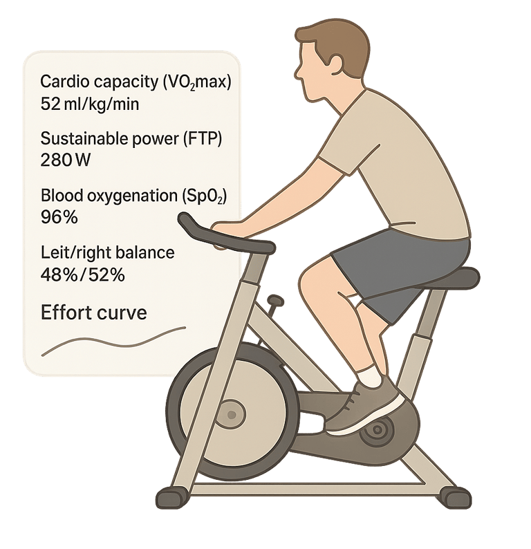 Mesure la VO₂max (ECG), évalue la santé musculaire et la fatigue (EMG) et suit la saturation en oxygène (PPG).Capteurs intégrés au pédalier